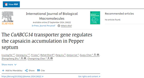 近日,园艺学院农业农村部重点实验室辣椒团队陈长明教授等人在International Journal of Biological Macromolecules(中科院一区Top期刊,影响因子7.7)在线发表了题为“The CaABCG14 transporter gene regulates the capsaicin accumulation in Pepper septum”的研究论文。
