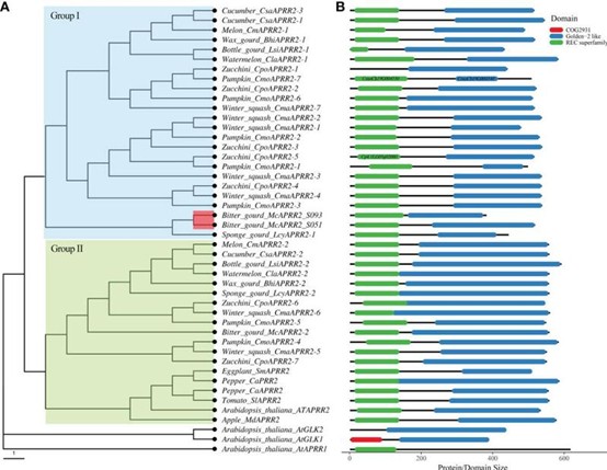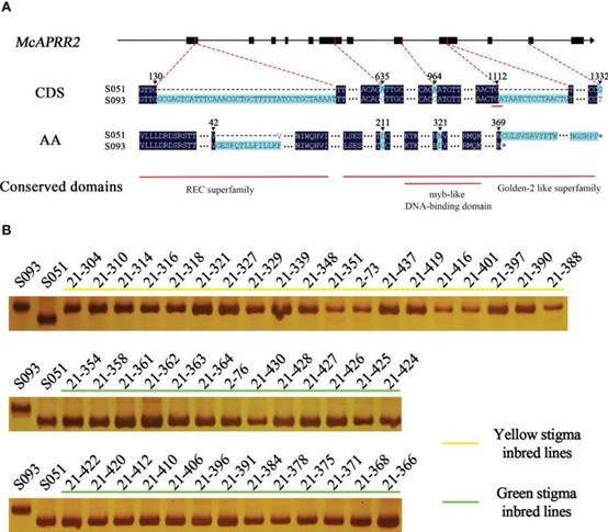 该研究首次对苦瓜柱头颜色基因精细定位至苦瓜6号染色体13.87 kb区间内,该区间内仅有一个与拟南芥双组分响应类调控因子基因AtAPRR2同源的基因Mc06g1638(图1)。对该基因进行序列分析发现,第九外显子上一个15 bp片段的插入导致APRR2蛋白翻译提前终止,且该15 bp片段插入同时存在于19个黄色柱头的苦瓜品种中(图2)。系统发育分析发现苦瓜APRR2基因与葫芦科果皮颜色相关的APRR2基因关系密切(图3)。该研究为开发苦瓜柱头颜色的分子标记辅助育种和阐明基因调控机制奠定了基础。