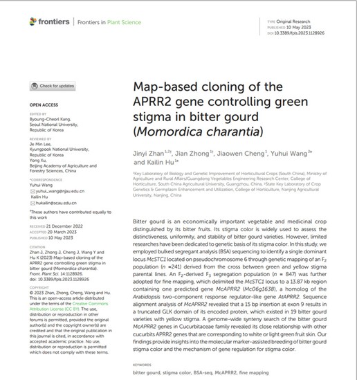 苦瓜是重要的经济蔬菜和药用作物,其柱头颜色广泛用于区分苦瓜品种特异性、一致性和稳定性。近日,园艺学院胡开林课题组完成苦瓜柱头颜色基因精细定位及候选基因克隆,相关成果在Frontiers in Plant Science(中科院生物学大类分区2区Top期刊,影响因子6.627)上发表。(论文链接:https://www.frontiersin.org/articles/10.3389/fpls.2023.1128926/full)。