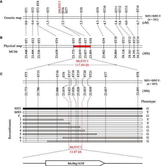 图1 苦瓜柱头颜色位点的遗传图谱和精细定位