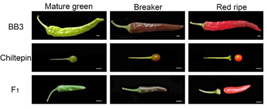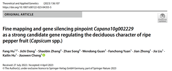 成熟果实脱把性是辣椒重要驯化性状之一,在辣椒加工产业具有重要潜在应用价值(图1)。近日,华南农业大学园艺学院胡开林/程蛟文课题组完成了辣椒成熟果实易脱把基因的精细定位、共分离分子标记开发以及重要候选基因——Capana10g002229的功能分析,相关成果发表在国际著名植物育种杂志Theoretical and Applied Genetics(中科院大类分区农林科学1区Top期刊,影响因子5.574)。