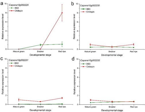 该研究首次将辣椒成熟果实易脱把基因座位精细定位至物理长度约38.03 kb的染色体区间,同时成功开发了可用于辅助选择育种的分子标记(图2)。进一步通过候选基因序列和表达比较分析(图3)以及病毒诱导基因沉默(图4)等分析,初步明确Capana10g002229为控制辣椒成熟果实脱把性的关键基因,该研究结果为深入阐明辣椒成熟果实脱把调控分子机理奠定了坚实基础。