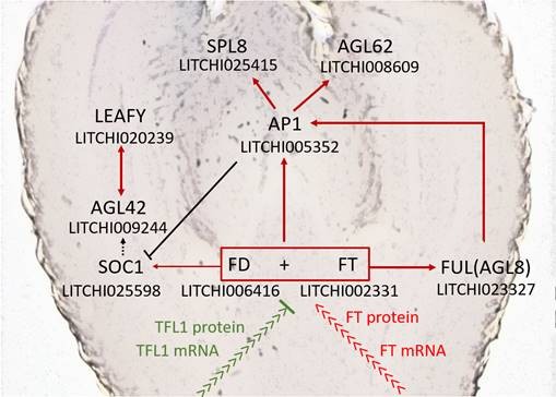 题为“SnRNA-seq and mRNA hybridization indicate key bud events and LcFT1 and LcTFL1-2 mRNA transportability during floral transition in litchi”(https://doi.org/10.1093/jxb/erad103)的论文,针对植物芽成花调控网络复杂,普通的bulk RNA-seq面临取样困难的技术壁垒,迫切需要具有更高分辨率、更好的细胞类型分离技术来解析植物成芽花转变分子机制的问题,以荔枝成花过程中关键发育时期的三种不同状态的芽为研究对象,首次建立荔枝芽样本的单细胞核测序体系,完成了首例荔枝单细胞图谱构建,确定了芽成花决定的关键细胞群(只占芽样品的5%),成功规避了细胞异质性对研究的干扰。同时以核测序未检测到关键成花基因FT和TFL1表达,而qRT-PCR可明显检测到它们表达为切入点,利用原位杂交、RNA点杂交等技术,证明荔枝成花关键的基因LcFT1和LcTFL1-2可以以mRNA的形式从叶片转运至芽。在模式植物的基础上,绘制了荔枝芽成花转变的分子调控网络模型,为进一步的研究提供了关键的分子靶标。