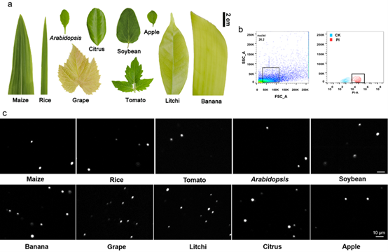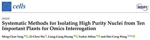 题为“Systematic Methods for Isolating High Purity Nuclei from Ten Important Plants for Omics Interrogation”(https://doi.org/10.3390/cells11233919)的论文,针对植物因为存在细胞壁和大量次生代谢产物,高质量原生质体难以获得,单细胞研究滞后于动物的问题,聚焦全球重要的十种经济作物,包括水稻、玉米番茄、大豆、苹果、葡萄、香蕉、柑橘和荔枝,开发了高效、高品质的植物核分离系统,成功克服了植物单细胞测序样本单细胞核分离困难、纯度低、得率少的难题,首次建立植物细胞核流式细胞仪绝对计数技术,同时实现细胞核的准确计数和回收分析。该论文是首例针对主要农作物高纯度细胞核详细的提取富集方法的报道,所分离纯化的细胞核的数量和纯度能满足细胞分裂周期和单细胞核测序研究的需要,研究结果将促进植物特别是木本植物单细胞水平的研究。