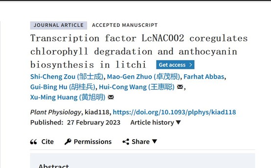 近日,华南农业大学园艺学院果树生理团队研究论文“LcNAC002 interlinks chlorophyll loss and anthocyanin synthesis by coregulating LcSGR and LcMYB1 expression in litchi”被Plant Physiology接收并在线发表。该论文揭示了荔枝果实成熟时叶绿素降解和花色苷积累的共同调控分子机制。