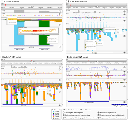 为了实现对小RNA注释结果的高效人工检查,本研究基于基因组浏览器(IGV)开发了IGV-sRNA,并将其作为一个功能模块整合在sRNAminer里。IGV-sRNA可以呈现各种特异的小RNA特征,使研究人员能够更全面地理解小RNA数据。另外,用户配合sRNAminer的“sRNA Viewer”功能,即可快速跳转到对应的小RNA位点上,从而高效地查看小RNA位点。此外,sRNAminer支持高质量PHAS位点图批量自动绘制及RNA二级结构可视化。sRNAminer可以真正实现从分析数据到人工检查可视化结果再到高质量图表绘制的小RNA分析流程闭环。