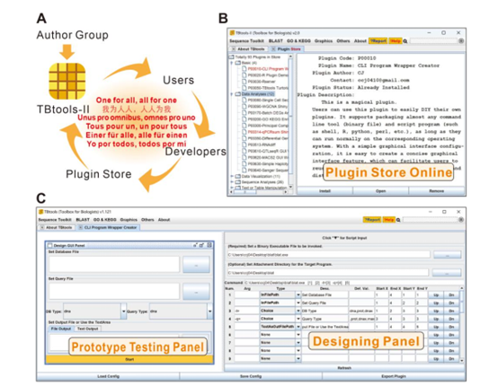 为辅助更多植物科学家处理生物大数据,TBtools-I应运而生,并于2020年08月发表于MolecularPlant期刊(Chenetal.,2020),截止目前引用>5000次。过去三年,随着植物生物信息领域的发展和个性化需求的增加,软件用户群个体持续增长,TBtools-I已用的功能和模式无法良好应对。因此,TBtools-II提出“我为人人,人人为我”的开发新理念,插件商店(PluginStore)也应运而生;突破团队的课题限制,通过提供简便的插件开发接口,使用户可以直接依据自己的需求,灵活的开发使用插件并分享,成为TBtools-II的创作者之一。当前,TBtools插件商店中已有94个插件,超过半数为TBtools用户开发,功能覆盖了生物文本处理和数据可视化等。
