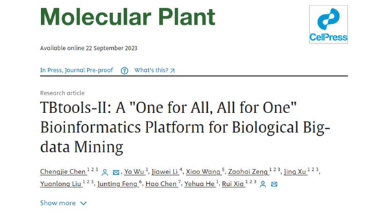2023年9月22日,园艺学院、亚热带农业生物资源保护与利用国家重点实验室夏瑞团队在MolecularPlant(IF=27.5)在线发表了题为TBtools-II:A"OneforAll,AllforOne"BioinformaticsPlatformforBiologicalBig-dataMining的研究论文,系统介绍和描述TBtools的新版本,即TBtools-II。TBtools-II在TBtools-I的基础上优化并新增了100+个功能,开发了插件(Plugin)模式并架设了插件仓库(PluginStore)。基于此,解决了软件功能全面性与灵活性的主要冲突。(论文链接:https://www.cell.com/molecular-plant/fulltext/S1674-2052(23)00281-2)、
