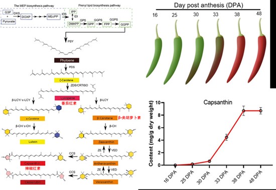 辣椒(Capsicum)是我国重要的蔬菜和调料作物,是典型的非呼吸跃变型果实。辣椒红素是辣椒成熟果实特异高度积累的一种类胡萝卜素,赋予成熟果实红色,决定果实外观和营养品质。同时,辣椒红素作为脂溶性天然色素,由于具有优异的抗氧化等生物活性和极高色价(色价E值即460nm处的吸光值)的特点,被作为重要的工业原料广泛应用于食品、医药、化妆品(高端口红、美妆)及饲料添加剂等领域。在食品添加剂领域,辣椒红素凭借色价高、着色力强、保色效果好和安全性高等优点被联合国粮食及农业组织(FAO)和世界卫生组织(WHO)列为A类色素(即在使用中可以不限量添加)。目前,全球辣椒红素市场规模达数十亿元,且以每年15%复合增长率增加。辣椒红素提取上游主要为辣椒原材料和生产检验设备,其中辣椒原材料质量直接影响辣椒红素提取行业发展,上游成本的结构中辣椒原材料成本占比超过90%,选育高产、多抗、高辣椒红素的辣椒品种是加工提取的关键。辣椒红素主要在辣椒果实转色期至成熟期合成,其合成基因PSY(八氢番茄红素合成酶),PDS(八氢番茄红素脱氢酶),β-CH(β-胡萝卜素羟化酶)和CCS(辣椒红素-辣椒玉红素合成酶)在转录水平层面控制辣椒红素含量,但是其合成的转录调控机制尚不清楚。因此,研究辣椒红素生物合成的分子遗传机制,为创制高辣椒红素辣椒新种质奠定基础。