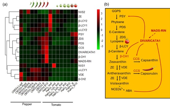 辣椒基因组测序表明,辣椒红素合成通路基因在茄科植物辣椒、番茄、茄子、马铃薯、烟草等植物中都存在,比较转录组学发现其关键基因特异在辣椒果实中转录是辣椒积累辣椒红素的原因。为了进一步明确辣椒红素生物合成的转录调控进化机制,本研究分析了辣椒、番茄、茄子、马铃薯等茄科所有已明确参与果实成熟和类胡萝卜素生物合成的转录因子和合成基因。结果表明,类胡萝卜素上游合成基因PSY、PDS和成熟核心调控基因MADS-RIN转录模式在茄科果实成熟过程中相对保守。然而,类胡萝卜素下游合成基因β-CH、CCS和DIVARICATA1特异在辣椒果实中获得高水平转录,表明它们功能茄科中出现了差异进化。进一步分析表明,辣椒中DIVARICATA1可以被MADS-RIN调控,表明MADS-RIN-DIVARICATA1模块参与辣椒果实成熟过程中类胡萝卜素的生物合成。该研究首次鉴定到了辣椒红素生物合成的关键调控基因,明确了ABA信号介导非呼吸跃变型辣椒果实类胡萝卜素生物合成的机制,并且发现了辣椒红素在茄科的生物合成差异调控的进化机制,为辣椒色泽遗传改良奠定了基础。