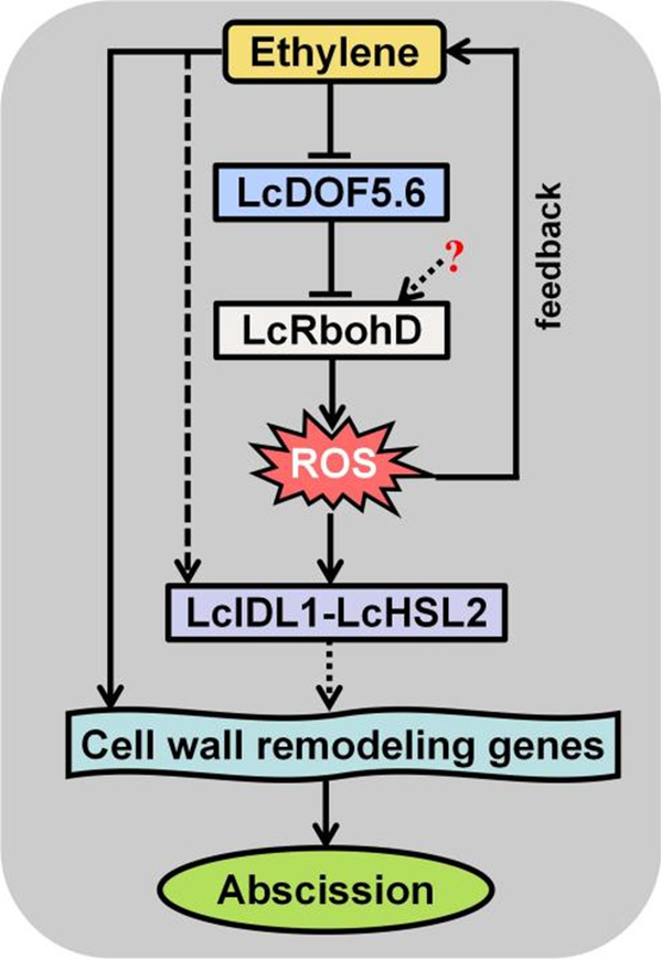 植物器官脱落过程中暴发大量的活性氧(ROS),但有关ROS参与植物器官脱落的分子机制目前还未清晰。荔枝是我国南方重要的特色果树,具有较高的经济价值,但生理落果严重,这极大地限制了荔枝产业的健康可持续发展。该研究首先证实,RBOH 的同系物LcRbohD在荔枝幼果脱落过程对 ROS 的产生至关重要,其表达在脱落过程中上调,从而使果实离区(FAZ)中的ROS积累增加。同时,LcRbohD的沉默可减少FAZ 中ROS的积累并降低荔枝幼果的脱落。 进一步研究发现,转录因子LcDOF5.6可直接结合LcRbohD启动子并抑制其表达。与此一致,LcDOF5.6的沉默会上调LcRbohD的表达,从而使FAZ中积累更高的ROS并促进幼果脱落。此外,LcRbohD和 LcDOF5.6也会影响脱落信号通路和乙烯通路中关键基因(如LcIDL1、LcHSL2、LcACO2、LcACS1和LcEIL3)的表达(图2)。
