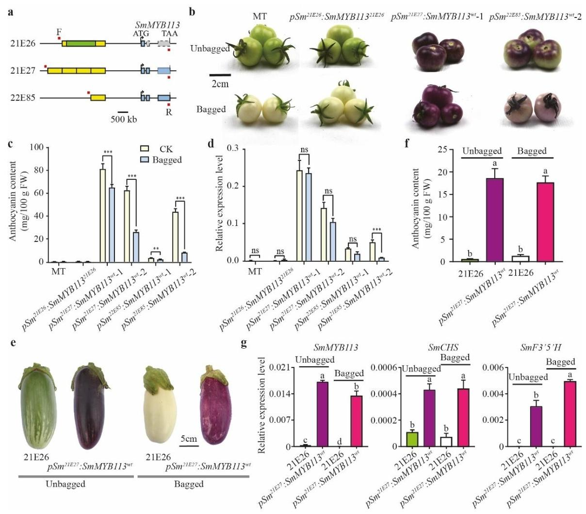 该研究首次阐明了启动子区域重复序列变异调控植物非光敏性花青素合成的分子路径,不仅丰富了果实着色调控的理论体系,更为茄子分子育种提供了可直接应用的技术手段。借助这些成果,育种家可精准选育非光敏性紫色茄子品种,有效提升设施栽培或密植条件下的果实商品品质,对推动茄子产业高质量发展具有重要意义。